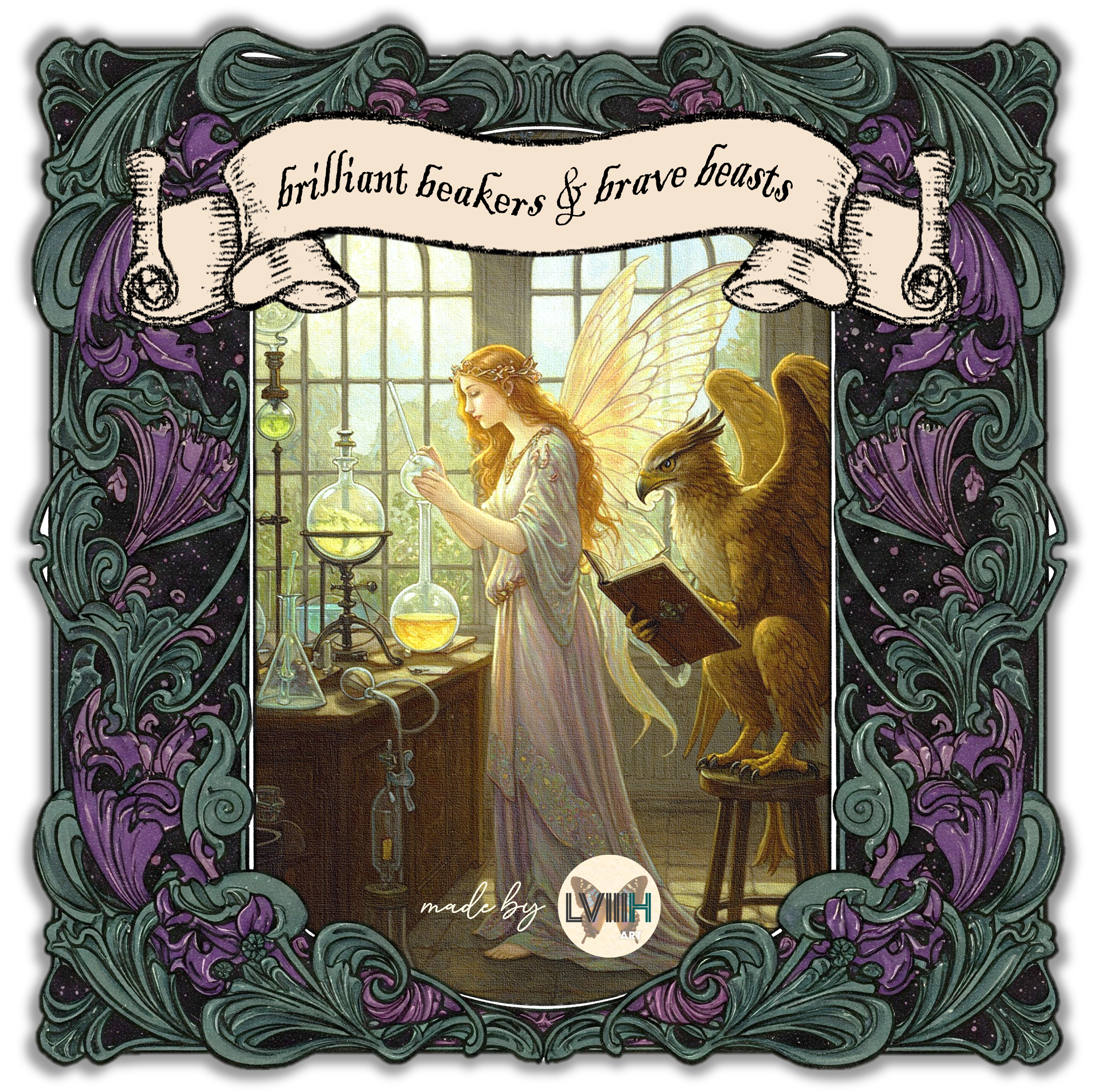 "brilliant beakers and brave beasts" is an enchanting art series that marries the whimsical allure of a fantastical realm with the captivating wonder of scientific exploration, igniting young imaginations with visions of magical creatures engaging in dazzling experiments