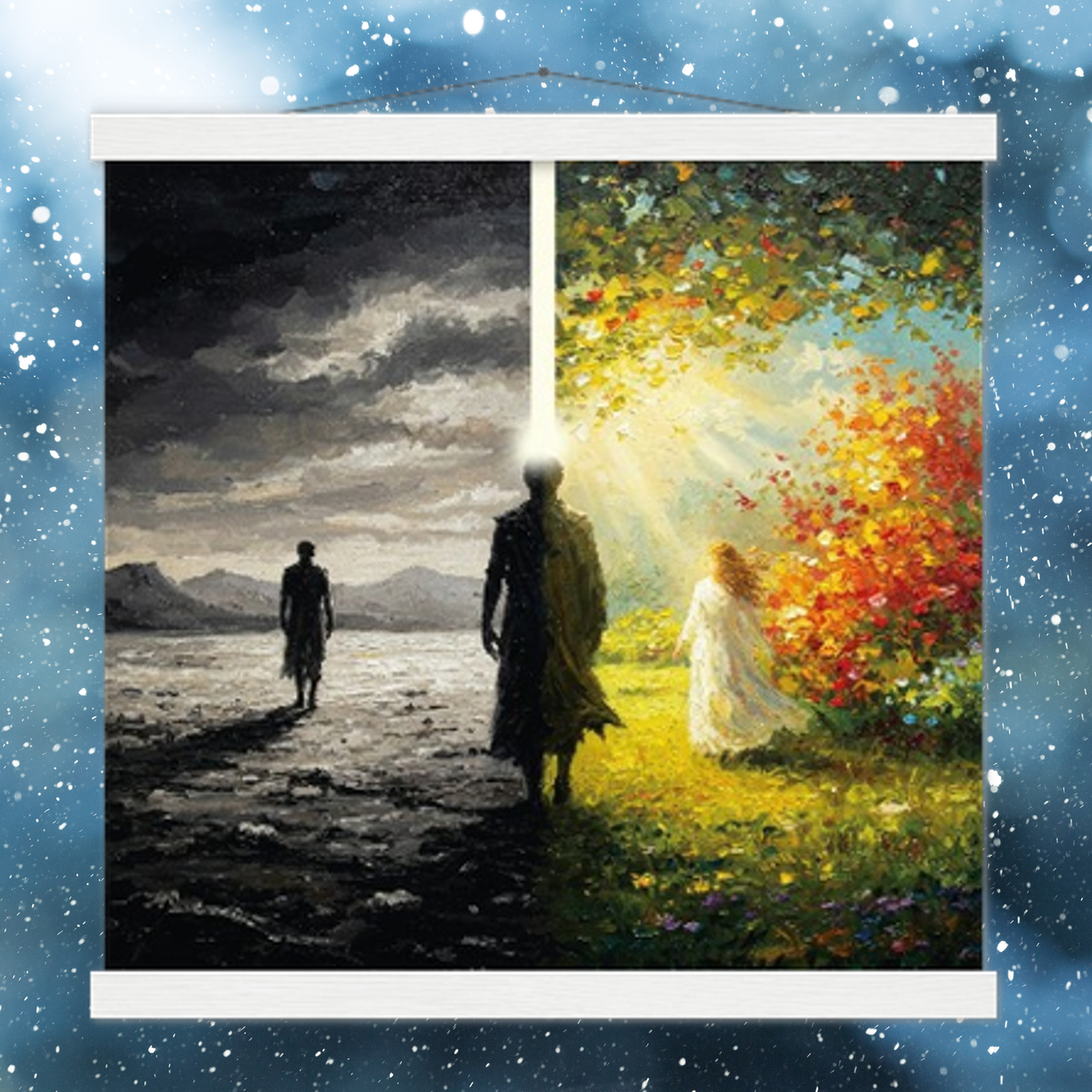 From the art series "fractured harmonies": discover the captivating beauty of this hanging poster, a striking piece that delves into themes of brokenness, dissonance, and the unexpected elegance that arises from disrupted equilibrium. This artwork invites you to reflect on the interplay between your environment and your perception, revealing how our current state of mind can alter the way we view the world around us.