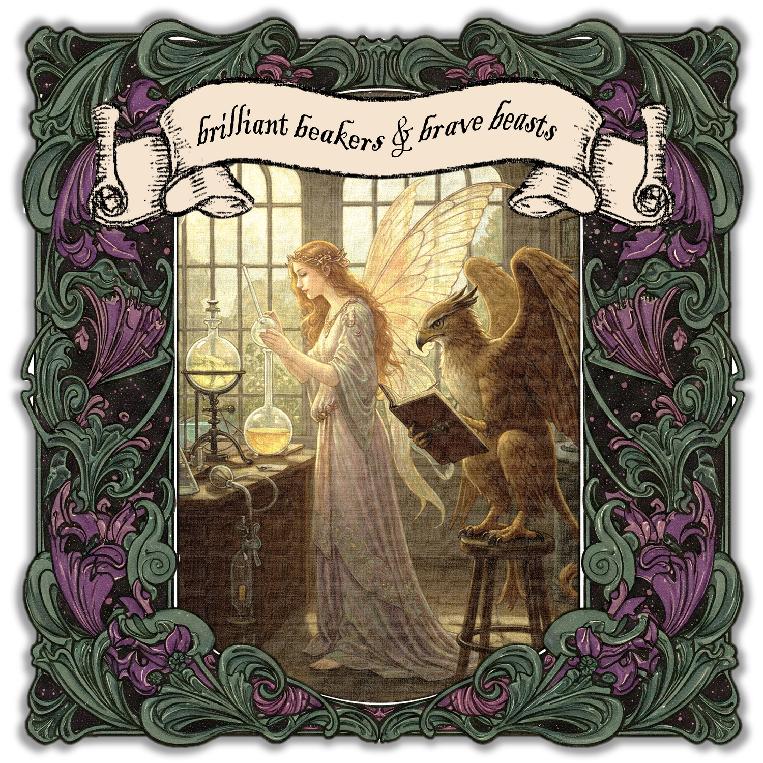 "brilliant beakers and brave beasts" is an enchanting art series that marries the whimsical allure of a fantastical realm with the captivating wonder of scientific exploration, igniting young imaginations with visions of magical creatures engaging in dazzling experiments